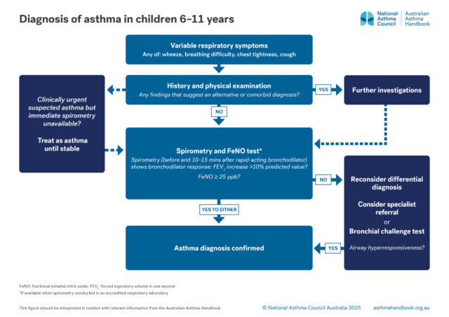 In children 6–11 years, FeNO ≥25 ppb supports the diagnosis of asthma in a child with signs and symptoms strongly suggesting asthma. See Diagnosing asthma in children 6-11 years.